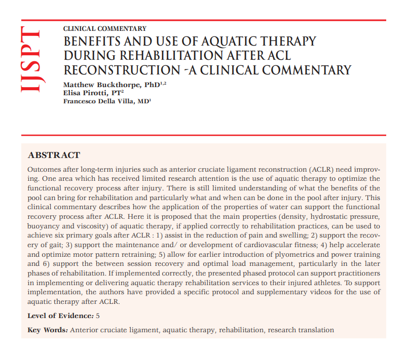 [1] Buckthorpe, M., Pirotti, E., & Della Villa, F. (2019). Benefits and Use of Aquatic Therapy During Rehabilitation After ACL Reconstruction - A Clinical Commentary. The International Journal of Sports Physical Therapy, 14(6), 978–993.